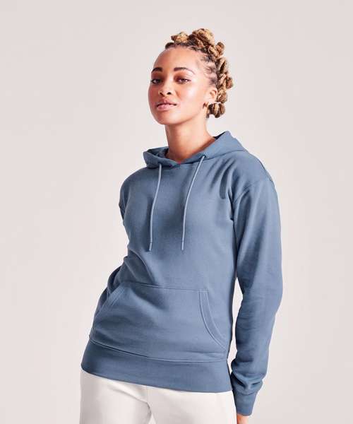 Soft hand feel. Double-fabric hood. Brushed inner fleece. Nickel-free, colour-matched eyelets and drawcord ends. Twin-needle detail. Cut and sew 1x1 ribbed cuffs and hem. Kangaroo pocket. Self-coloured neck size label.